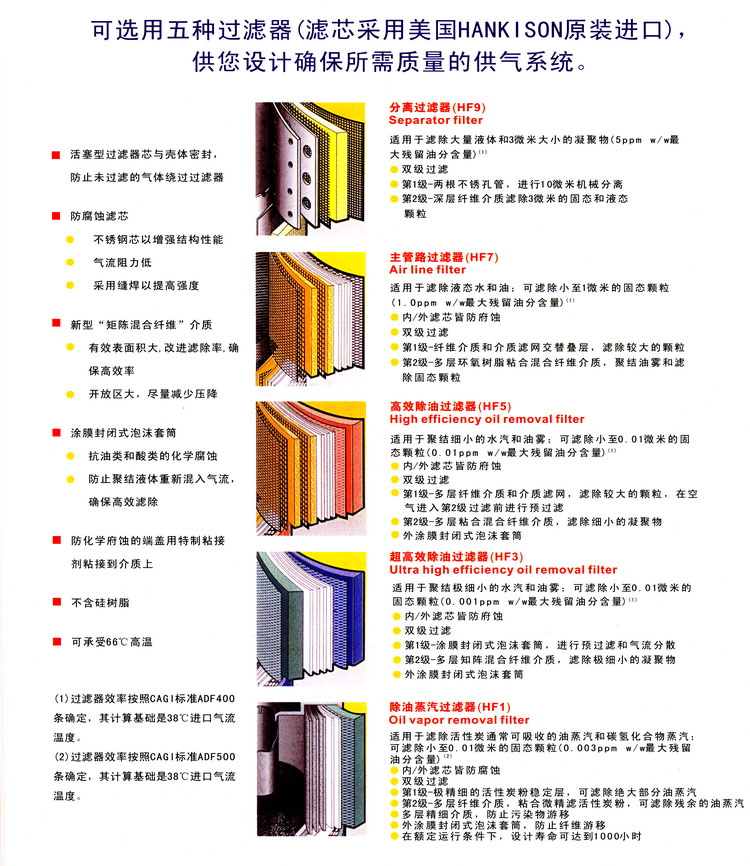 1、高效能去除水、油霧、固體顆粒,100%去除0.01μm及以 上顆粒、油霧濃度控制在0.01ppm/wt;