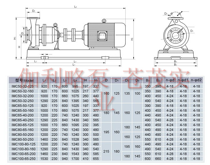 IMC(CIH) series magnetic-force drive centrifugal pump is a new type entirely non-leakage erosion-proof pump developed by our company, its technology reaches the level of the con-generic products from overseas, and the capability, dimension and mark are in conformity with ISO2858/GB5662/DIN24256. Its external installation dimension is the same with that of IH type pump, and is convenient to replace and use.