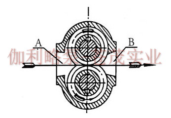 2CY、KCB齒輪式輸油泵在泵體中裝有一對回轉齒輪,一個主動,一個被動,依靠兩齒輪的相互嚙合,把泵內的整個工作腔分兩個獨立的部分。A為入吸腔,B為排出腔。泵運轉時主動齒輪帶動被動齒輪旋轉,當齒化從嚙合到脫開時在吸入側(A)就形成局部真空,液體被吸入。被吸入的液體充滿齒輪的各個齒谷而帶到排出側(B),齒輪進入嚙合時液體被擠出,形成高壓液體并經泵的排出口排出泵外。