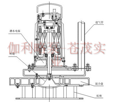 QXB型潛水離心式曝氣機采用電機和葉輪直接傳動,利用葉輪旋轉所產生的離心力排開周圍水形成低壓區吸入水流同時,在葉輪進口處制造真空而吸入空氣,在混氣室中氣與水充分混合形成均勻的氣水混合液,在離心力作用下快速排出。